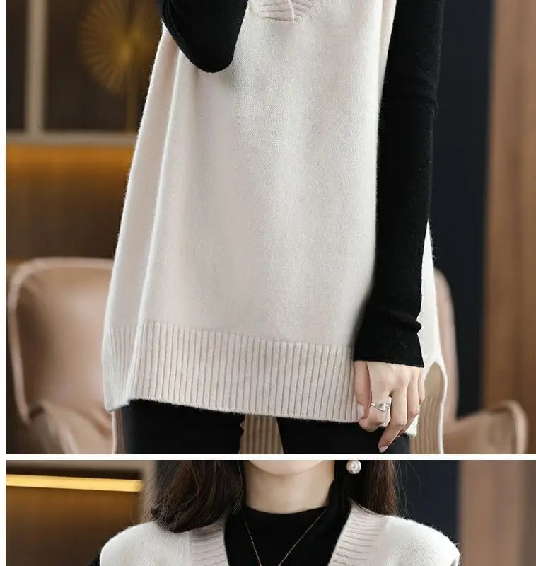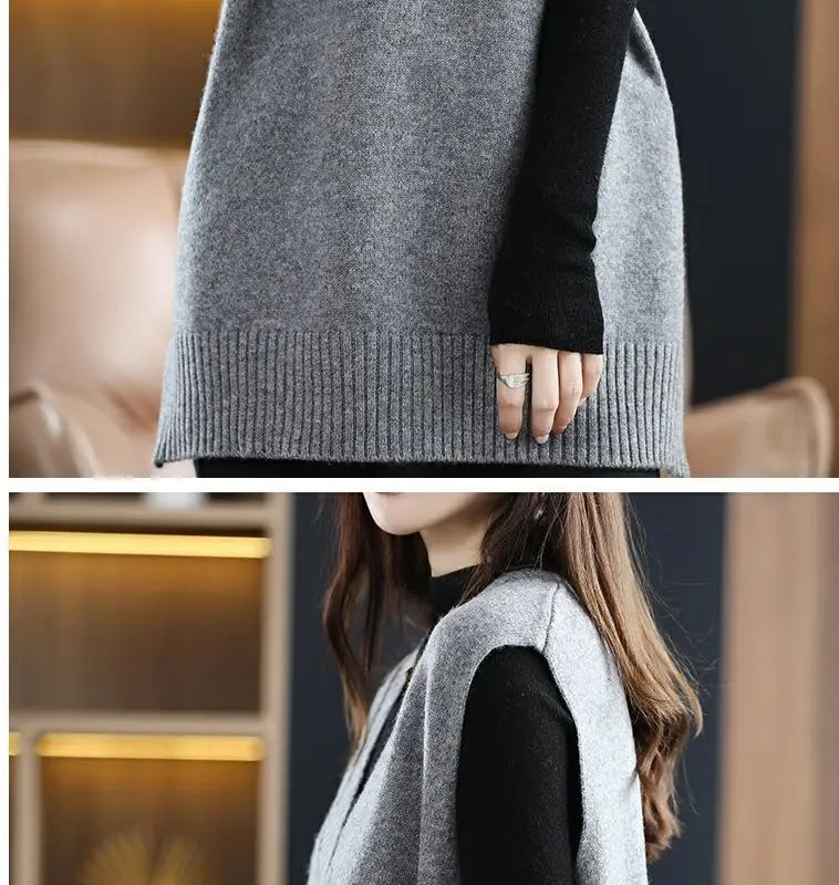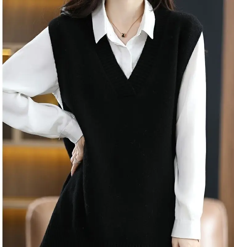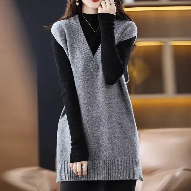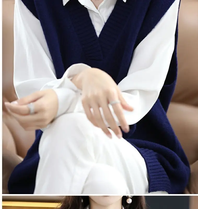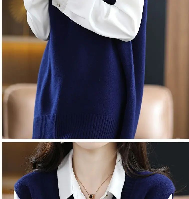 Navy blue plus size vest, medium to long length, in knit fabric.