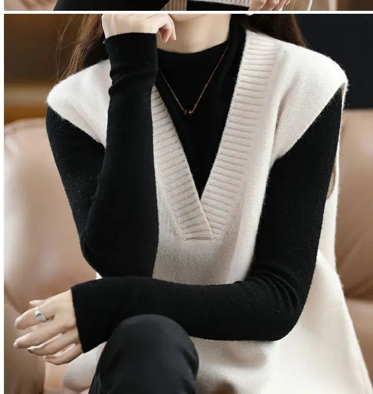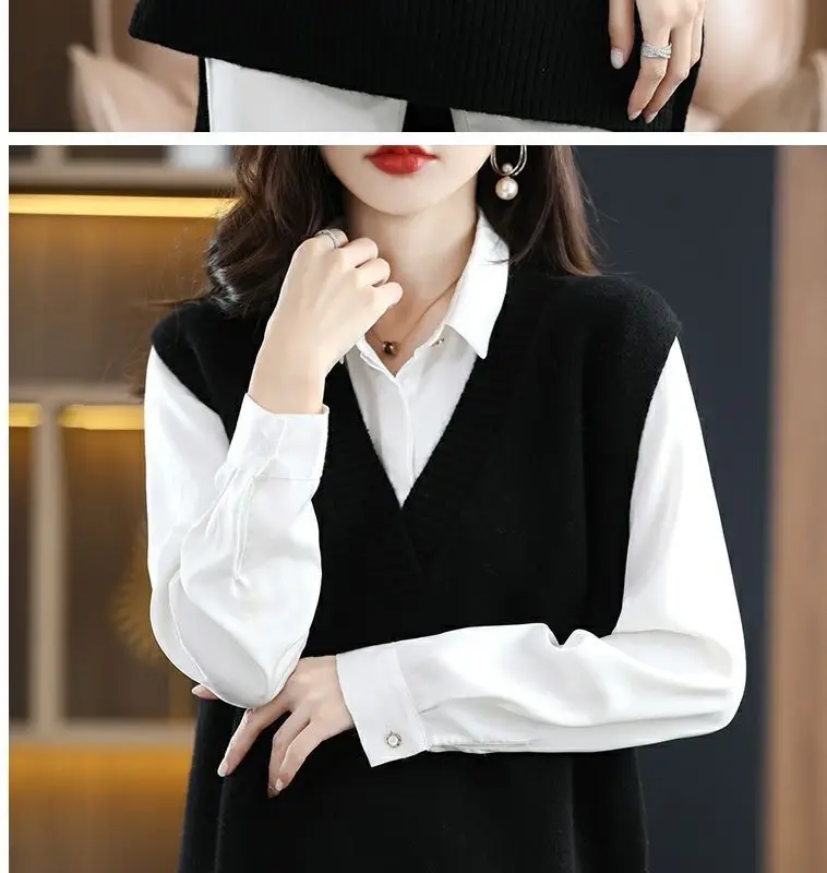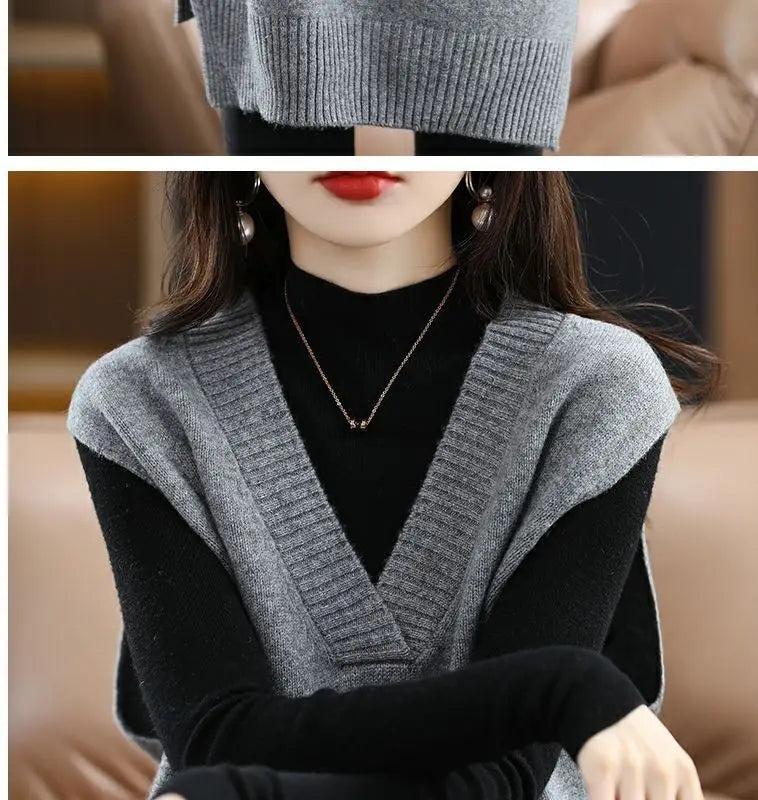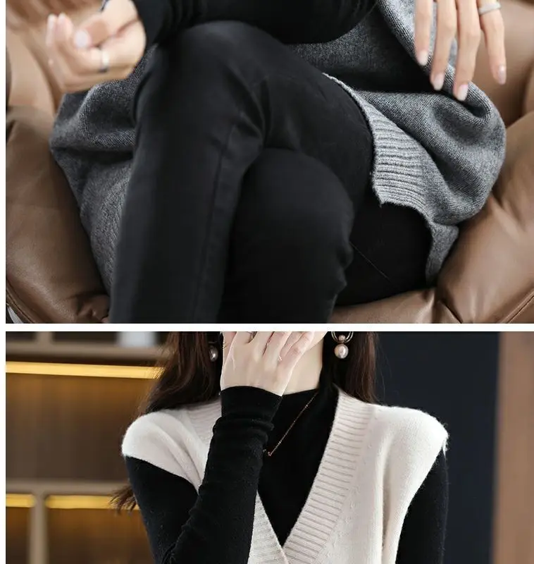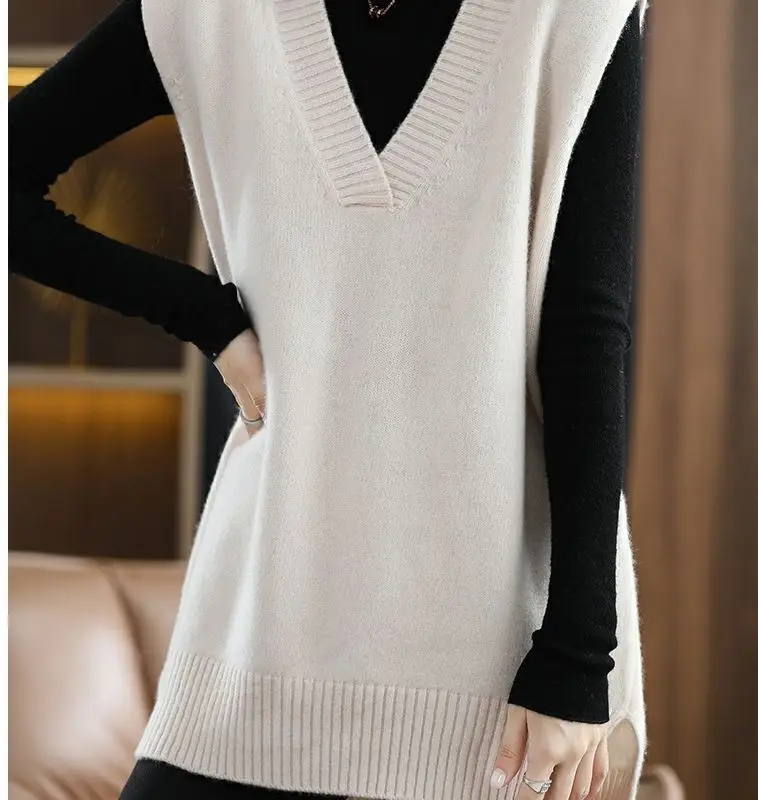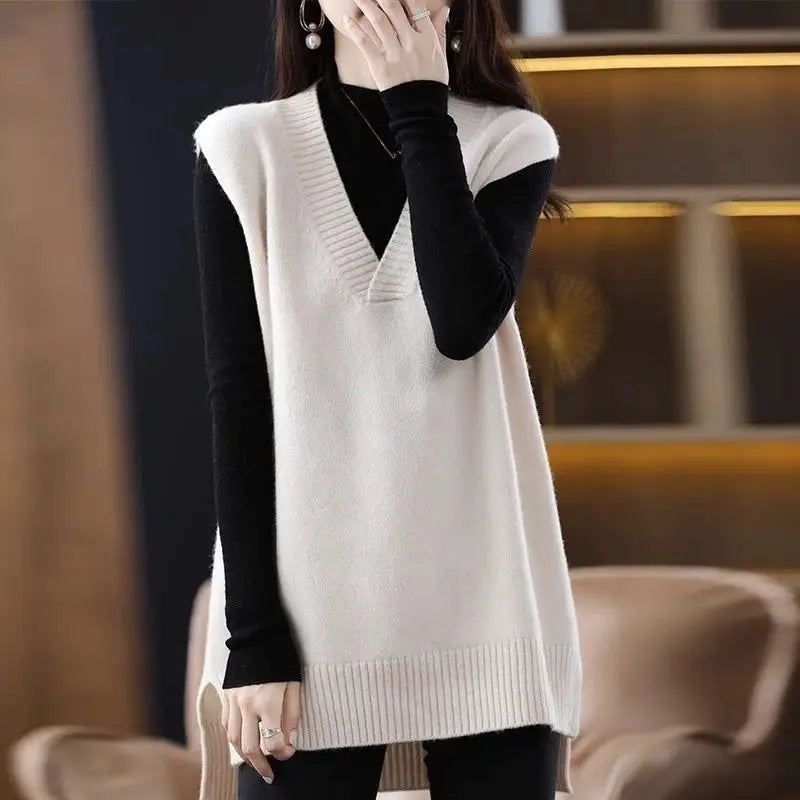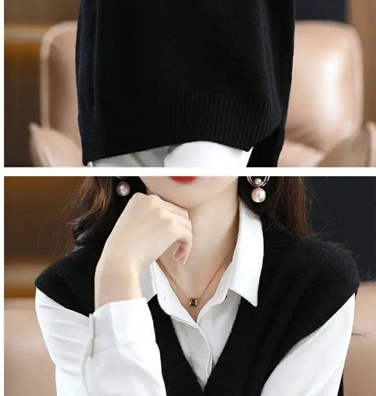 Navy blue plus size vest, medium to long length, in knit fabric.