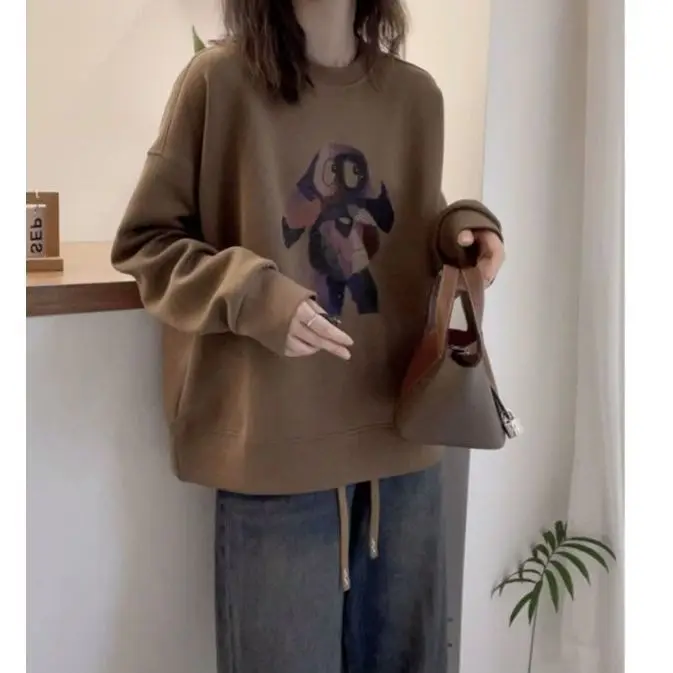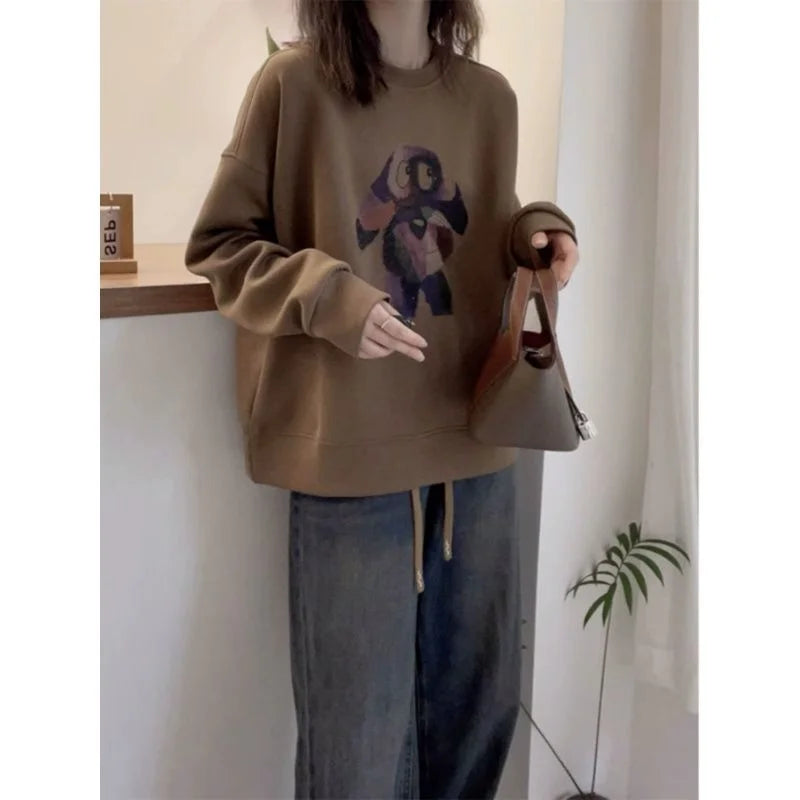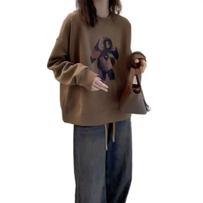 Plus Size Fleece Round Neck Sweatshirt Loose Casual Pullover Malat Brown Top