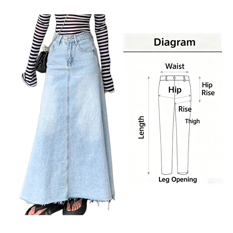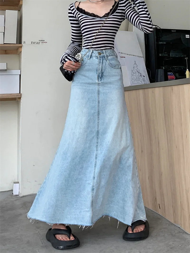 Product Name: Light Blue High-Waisted Denim A-Line Skirt with Raw Hem