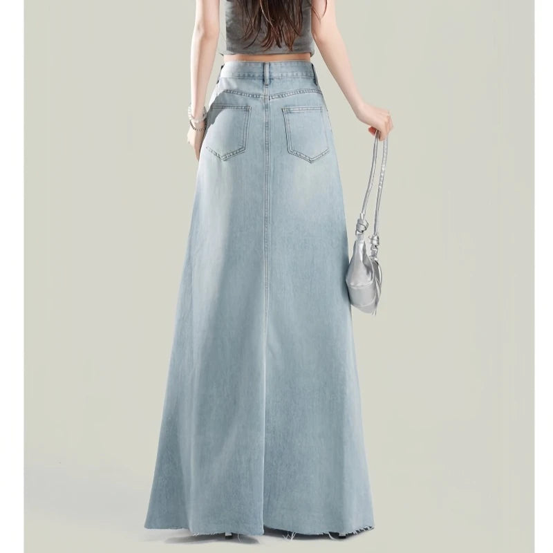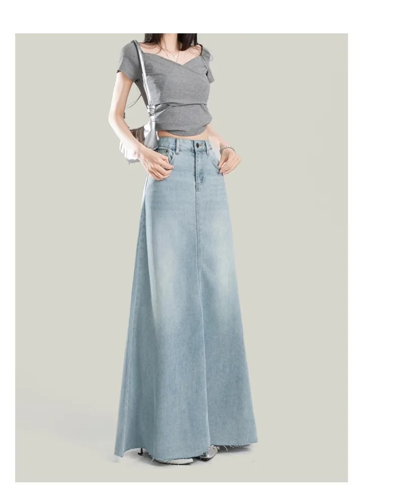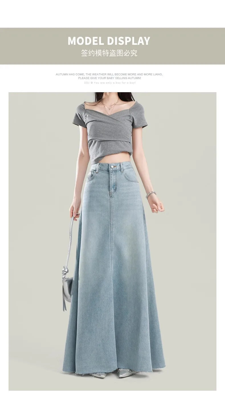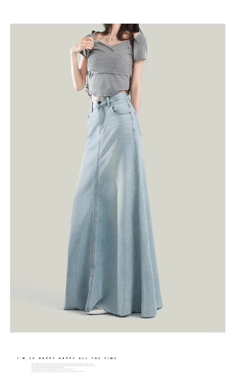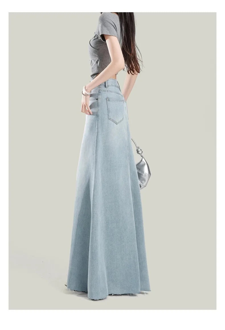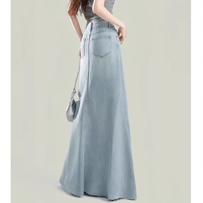 Korean Fashion High Street Commuter Light Blue Denim Maxi Skirt Women Spring Summer A-line High Waisted Bodycon Jeans Long Skirt