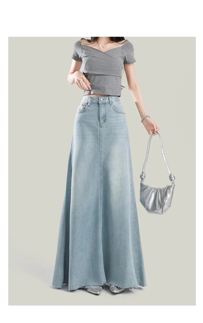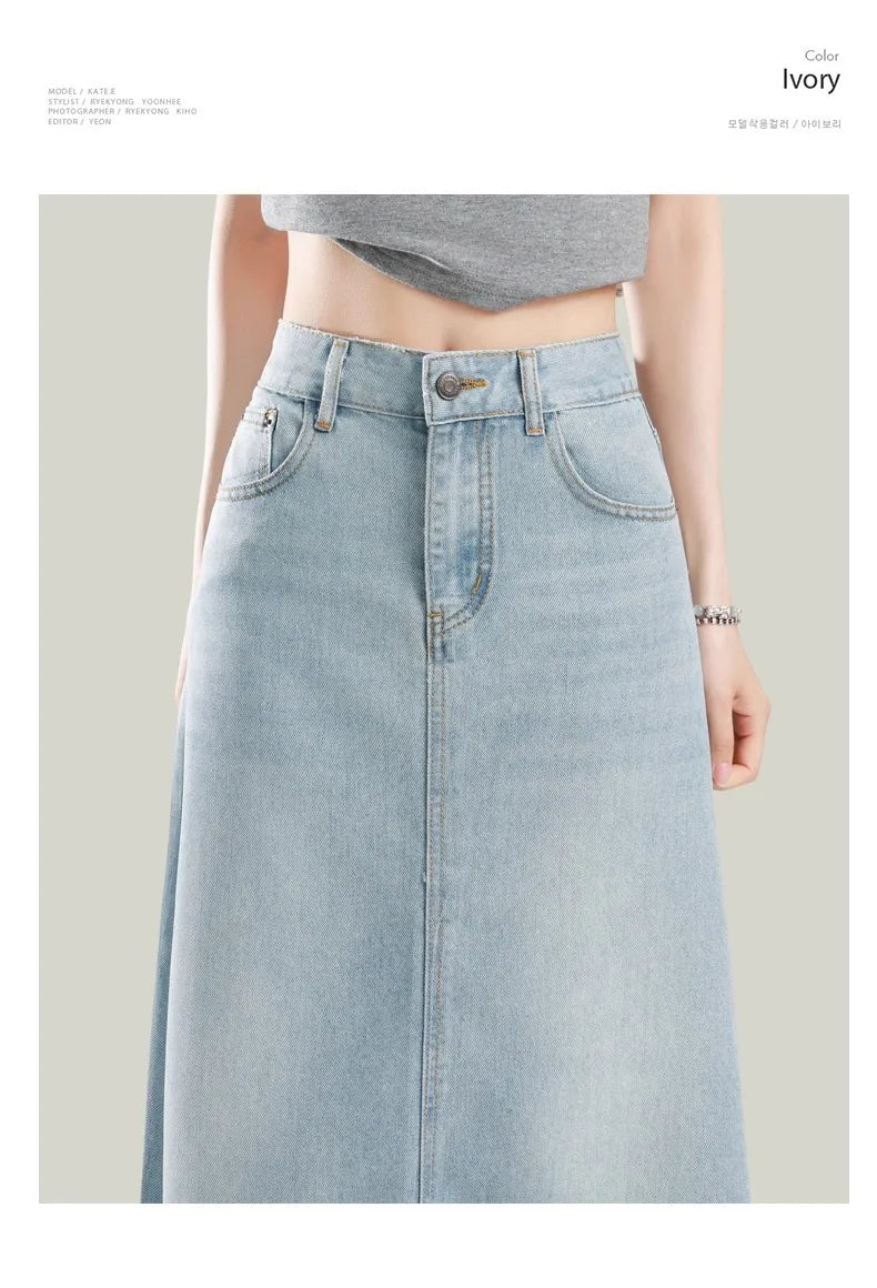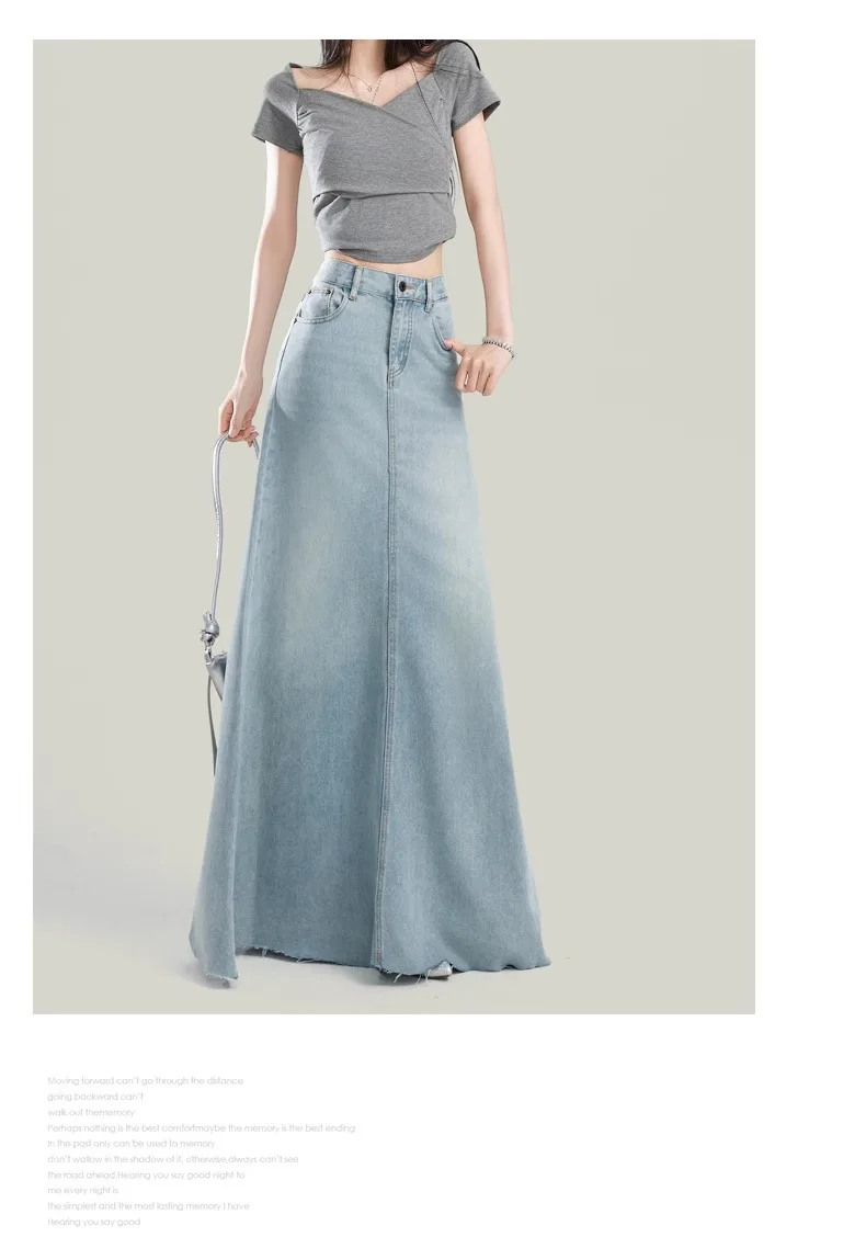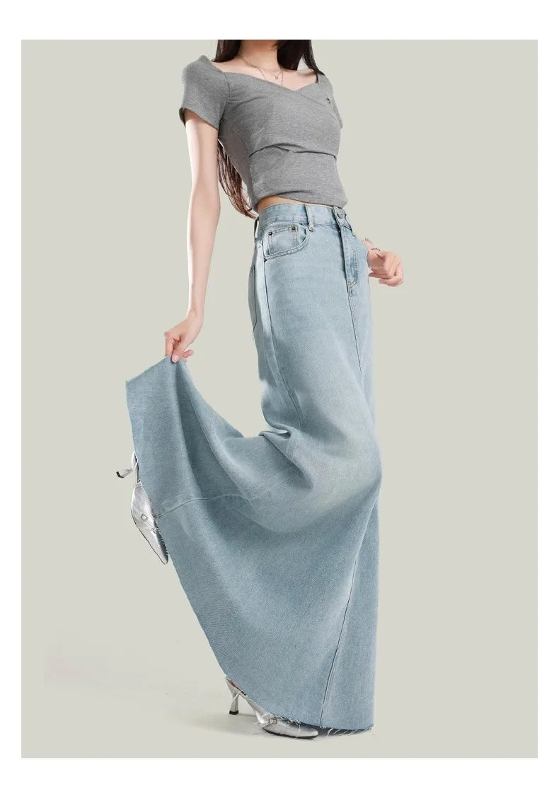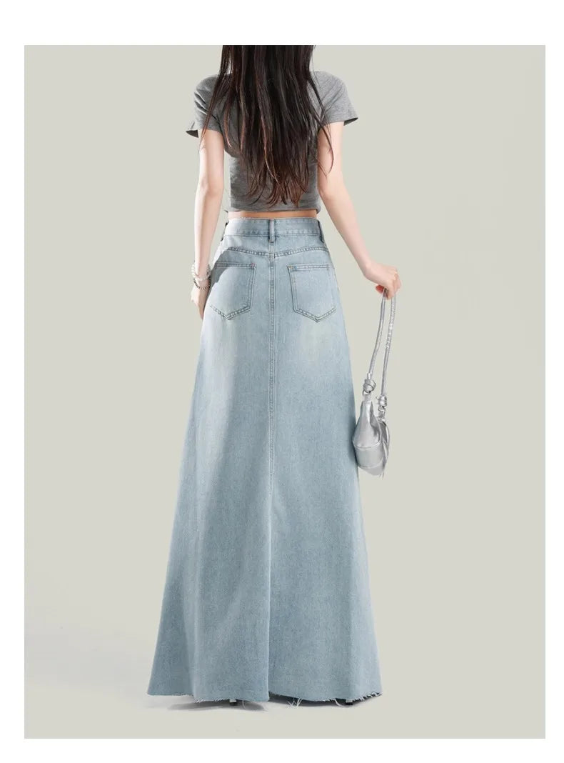 Korean Fashion High Street Commuter Light Blue Denim Maxi Skirt Women Spring Summer A-line High Waisted Bodycon Jeans Long Skirt
