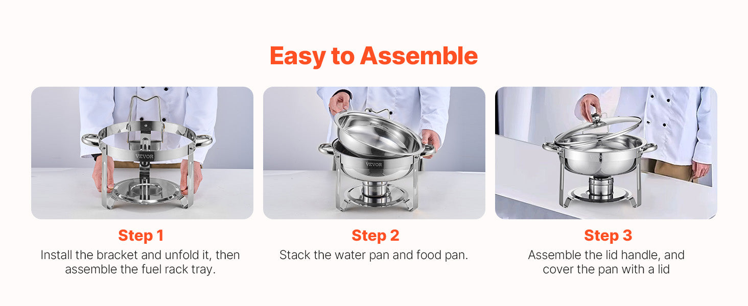 Space-Saving Design: This chafer set features an easy-to-assemble, folding design that saves valuable storage space. Its compact nature ensures that it can be conveniently stored without taking up much room